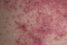 Высыпания расположены на гиперемированной области в виде различных пузырьков, волдырей, папул разного размера, сливающиеся в различные очертания.